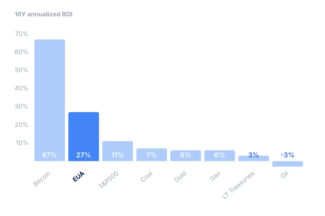 EUAs hebben de afgelopen tien jaar een sterke stijging van +27,2% laten zien, beter dan veel andere activaklassen. Ze zijn een aantrekkelijke toevoeging aan portefeuilles die diversificatie zoeken met potentieel voor hoge rendementen.