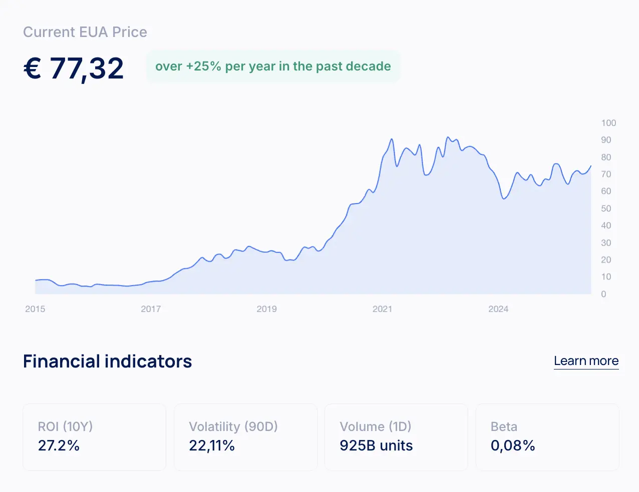 EUAs zijn financiële instrumenten onder MiFID II, uitgegeven door de Europese Commissie met een gelimiteerde, afnemende voorraad, wat de waarde verhoogt. Ze behoren tot de best presterende activa van het afgelopen decennium, met een jaarlijkse stijging van +25%, beter dan de meeste grote activaklassen. Experts voorspellen aanhoudende prijsgroei door het marktontwerp.